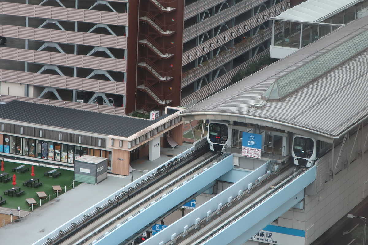 ゆりかもめが90度の角度で曲がっていく、眼下には市場前駅、そして曲がった直線の先には有明テニスの森駅が見える。